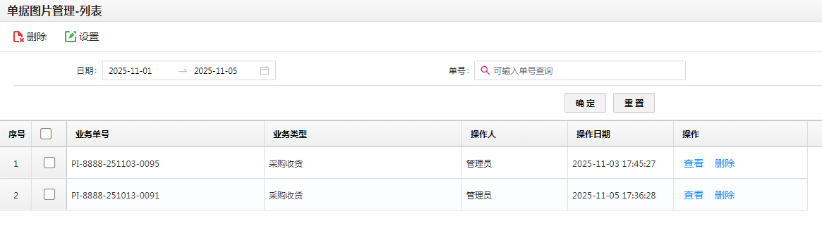 单据图片管理-列表用于管理采购收货单据上传的图片,根据单据号进行查询;1、支持删除,查看图片2、图片默认保存3个月,超过3个月的会自动清除 如图所示 查看:如图所示 文档更新时间: 2025-11-05 09:52 作者:chenzhx