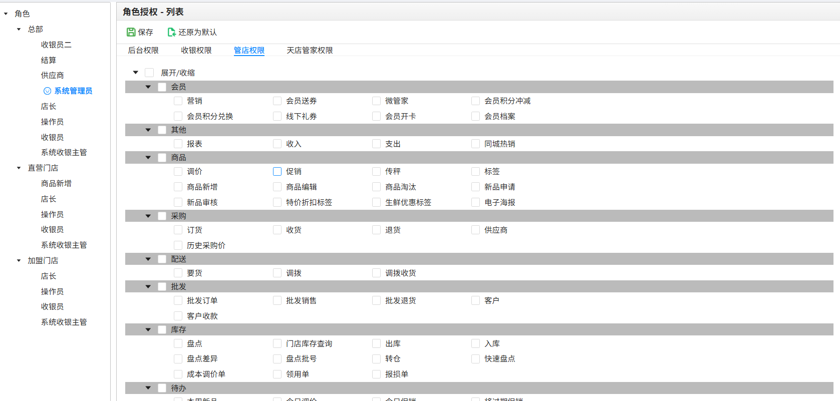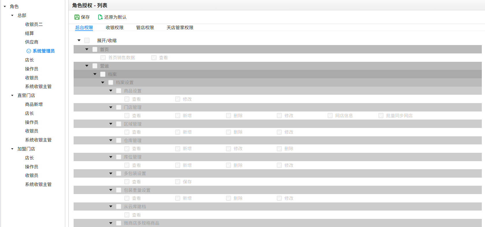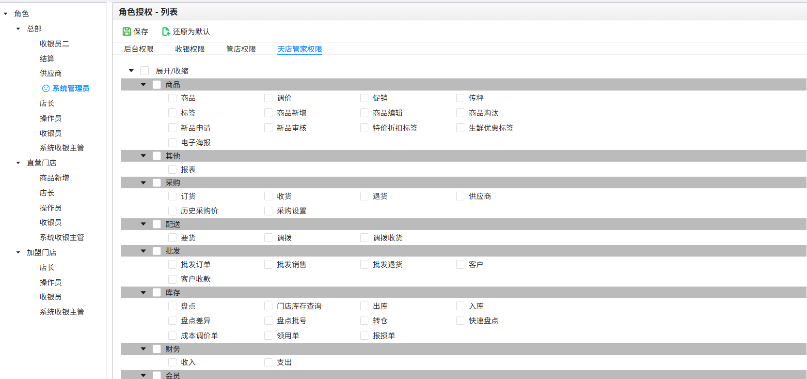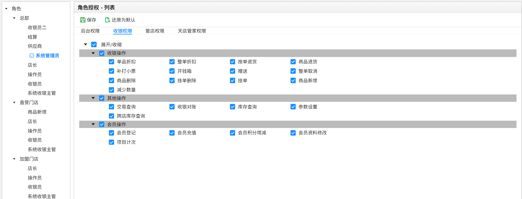 (1)总部:系统管理、店长、操作员、系统收银主管;