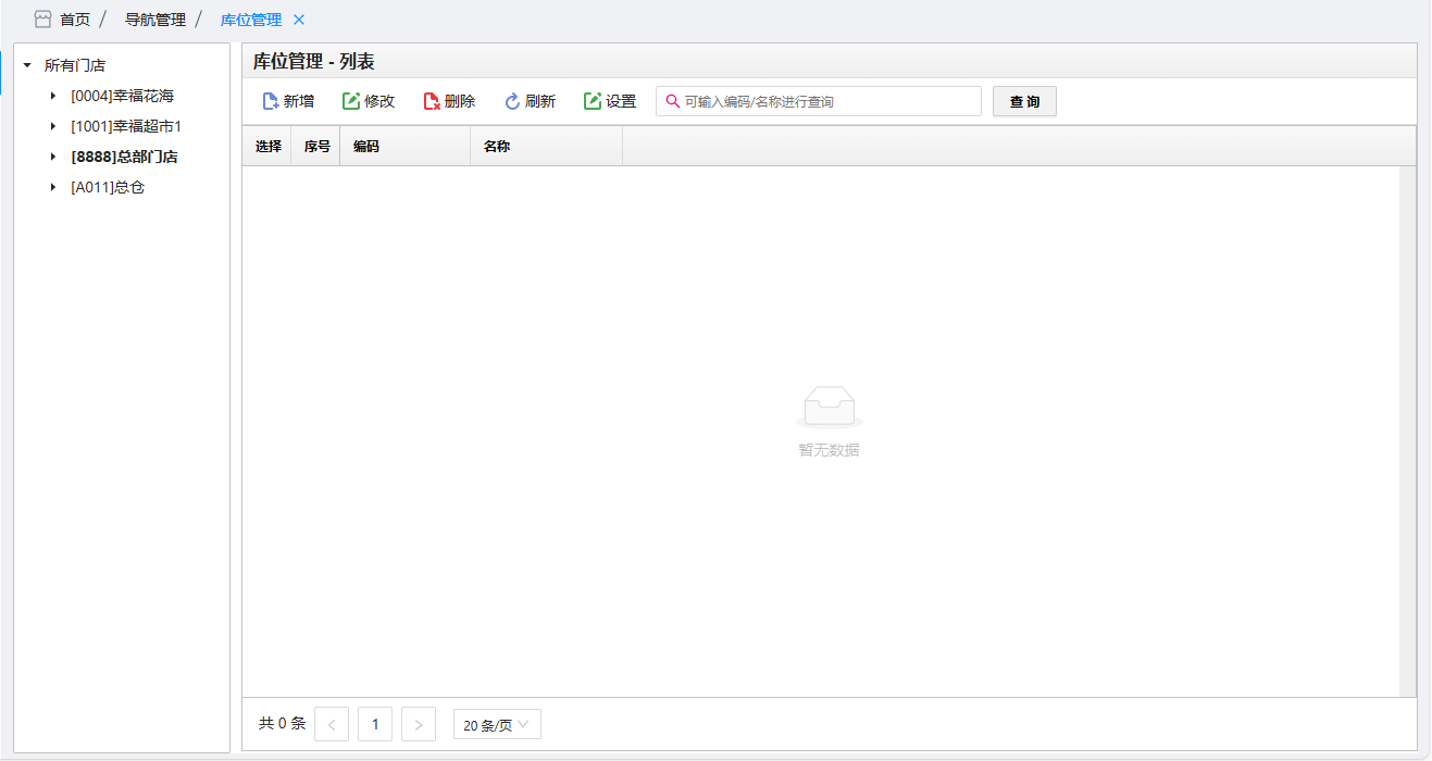 位置:【档案】->【门店信息】->【库位管理】 功能:为大型超市的多仓库,多库位存放商品的业务,支持门店多仓位业务,便于商品货物的分拣与盘点。需要点击对应门店下所属仓库进行库位相关显示操作。 如图所示 文档更新时间: 2025-09-16 06:43 作者:杨瑜