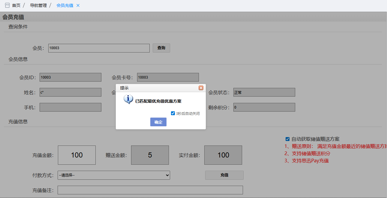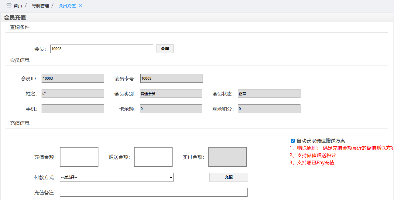 位置:【会员】-> 【会员储值】-> 【会员充值】