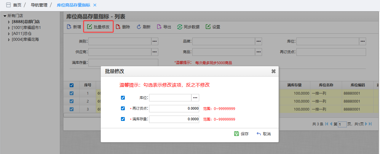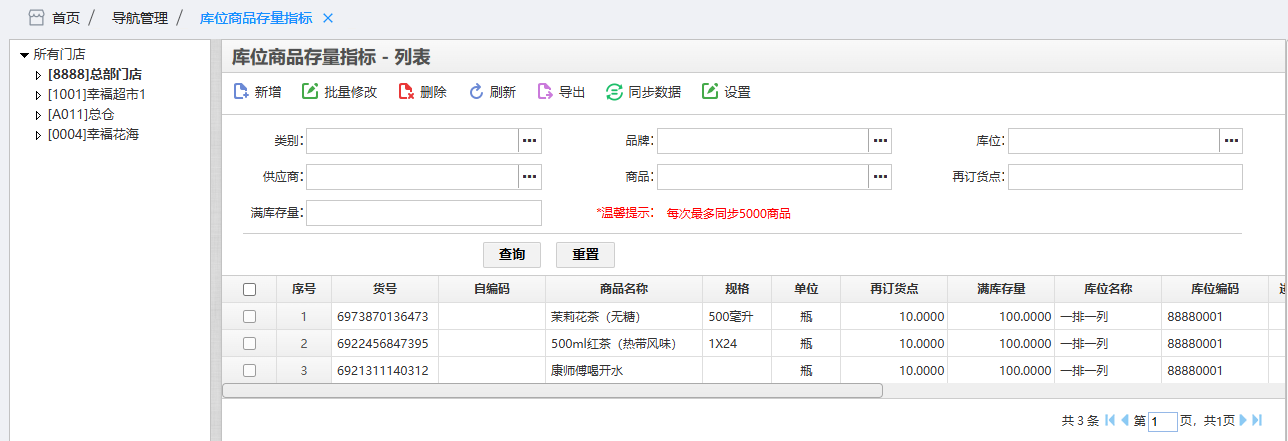 位置:【库存】->【库存业务】-> 【库位商品存量指标】 定义:满库存量——>库存高位,再订货点——> 库存低位。支持按门店设置,新增,批量修改,删除,导出,同步数据。 如图所示 1、新增商品库位,支持多选商品,模板下载导入商品,设置库位 如图所示 2、支持批量修改商品库位,再订货点和满库存量。 如图所示 3、同步数据,每次最多同步5000商品,同步商品没有默认选择库位,需修改。 文档更新时间: 2025-09-17 07:27 作者:杨瑜