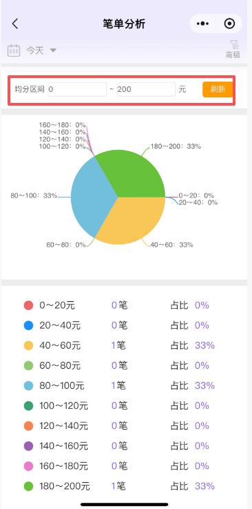 笔单分析默认统计0~100之间,分成10个区间,统计每个区间内的交易笔数和占比情况;均分区间支持手动输入金额范围,输入后刷新即可查到最新统计情况。 如图所示 文档更新时间: 2026-01-27 08:04 作者:徐珍