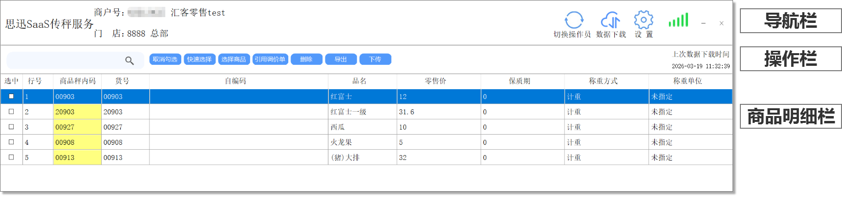 (2)数据下载:传输后台的数据情况到本地,用于下发到秤上处理。支持全量下载和增量下载。