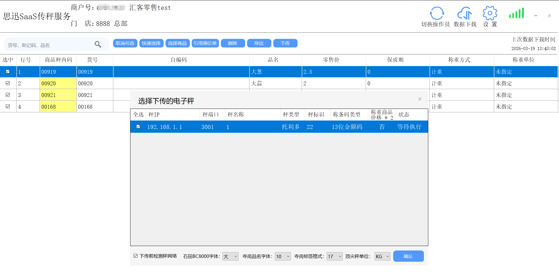 (7)下传: 选中商品,选择秤,确认操作传称