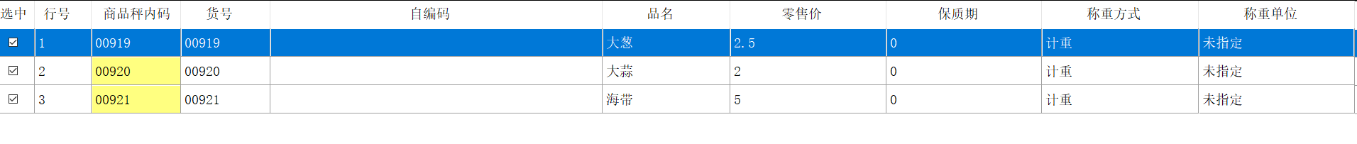显示字段:行号、商品秤内码、货号、自编码、品名、零售价、保质期、称重方式、称重单位