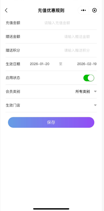 - 会员类别:针对特定会员类别定制充值优惠,只需选定类别,该类别下的会员将遵循所设规则;选择不限制”选项则使得所有会员类别都能享受通用的充值规则