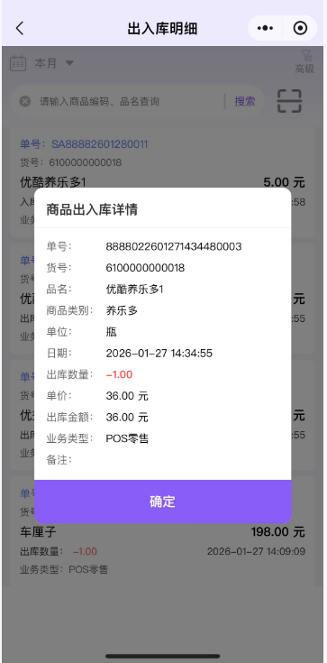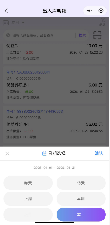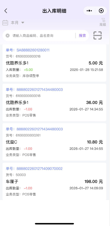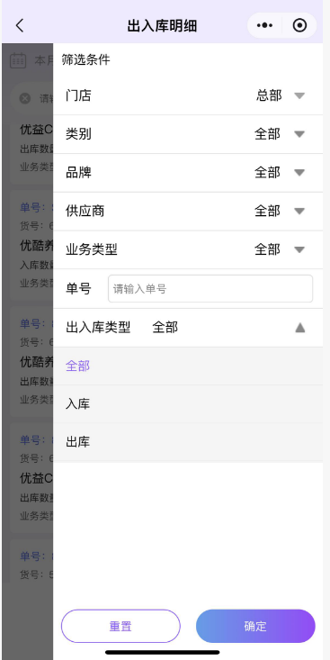 出入库明细用于查询各商品所有出入库业务的明细数据,点击商品还可查询商品出入库详情。 如图所示 点击左上角,可以筛选日期查看数据;点击右上角,可以筛选门店、类别、品牌、供应商、业务类型、单号、出入库类型查看门店数据;其总部账号默认支持查询各个门店数据,分店仅能查询所属门店数据。 如图所示 文档更新时间: 2026-01-28 08:18 作者:徐珍