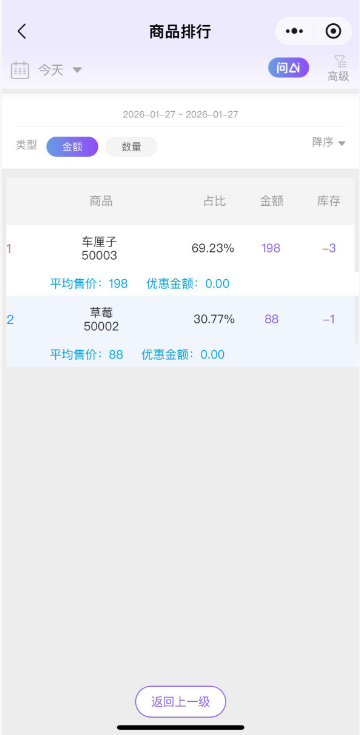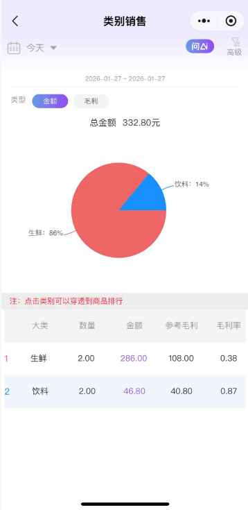 目录 搜索 汇客·学习指南汇客·Windows前台使用须知注册&前台登录界面使用销售商品查询会员结算退货其他微订单聚合外卖库存查询交易查询收银对账系统功能帮助导航风格切换最小化收银对账设置POS快捷键打印 & 钱箱外设秤相关其他扫码付主题界面设置模板锁屏退出场景应用营业员使用流程挂单使用流程培训模式预设商品业务AI使用流程预包装使用流程类别限定显示常见咨询安装咨询登录咨询核销咨询交易时已经支付款项,但是软件未有流水记录结算咨询适配型号大全打印机型号适配计价秤支持型号客显支持型号叠加器支持型号汇客·安卓POS收银一、登录二、收银2.1 收银界面介绍2.2 收银流程介绍三、商品四、会员五、生意六、对账七、设置1.用户信息2.业务设置3.硬件设置 4.生鲜条码格式5.传称6.标签打印7.语音播报8.参数导入导出9.畅销商品10.关于八、更多九、支持促销类型十、安卓POS适配大全汇客.手机APP收银下载安装登录app开单销售按单退货交易查询收银对账系统设置数据下传库存盘点更多功能退出登录汇客·管店小程序使用须知工作台微管家商品管理营销管理订单管理报表查询应用商品AI采购配送库存会员报表营业分析营业分析毛利分析门店分析笔单分析商品排行类别销售商品毛利我的月报年报商品查询库存查询收银查询收银对账交易明细查询收银异常操作会员查询会员分析营业员销售查询我的VIP增值服务多账号切换系统设置打印设置总部订货、收货快速查询商品门店库存收货快速引用商品生成调价单单据详情显示售价及售价金额收货/调拨引用单据时自动读取数量电子海报市斤计价标签设置汇客·管家使用须知首页应用常用功能待办保质期预警商品商品档案商品淘汰调价促销标签特价折扣标签生鲜优惠标签AI拍照建档拍照收货AI管家采购订货收货退货供应商历史采购价采购设置配送要货调拨调拨收货库存盘点门店库存查询入库出库会员会员档案会员开卡积分冲减积分兑换会员设置会员类别积分规则充值优惠规则零售付款方式设置支付设置POS登记前台销售设置微管家商品管理营销管理订单管理报表查询系统用户管理授权码标签设置消息推送报表常用功能营业分析营业分析毛利分析门店分析笔单分析商品排行类别销售品牌销售商品毛利我的月报年报商品查询库存查询库存调整查询出入库明细收银查询收银对账交易明细查询收银员异常操作会员查询会员分析储值明细会员消费明细会员积分明细营业员销售查询我的故障报修多账号切换系统设置完善商户基本资料付费用户管理汇客·价签工具汇客传秤工具传秤工具·支持型号传秤工具·使用流程 暂无相关搜索结果! 本文档使用 MinDoc 发布 门店分析 门店分析按“POS金额”、“销售笔数”、“客单价”、“毛利润”四个维度分别统计,可点击不同项目查看对应的柱形图。 如图所示 报表穿透 点击pos金额可以穿透到类别销售报表(金额类型),再点击类别可以穿透到商品排行报表;点击客单价可以穿透到笔单分析报表,均分区间可以手动修改;点击毛利润可以穿透到类别销售报表(毛利类型),再点击类别可以穿透到商品排行报表; 如图所示 文档更新时间: 2026-01-27 08:01 作者:徐珍