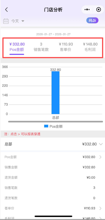 门店分析按“POS金额”、“销售笔数”、“客单价”、“毛利润”四个维度分别统计,可点击不同项目查看对应的柱形图。 如图所示 报表穿透 点击pos金额可以穿透到类别销售报表(金额类型),再点击类别可以穿透到商品排行报表;点击客单价可以穿透到笔单分析报表,均分区间可以手动修改;点击毛利润可以穿透到类别销售报表(毛利类型),再点击类别可以穿透到商品排行报表; 如图所示 文档更新时间: 2026-01-27 08:01 作者:徐珍