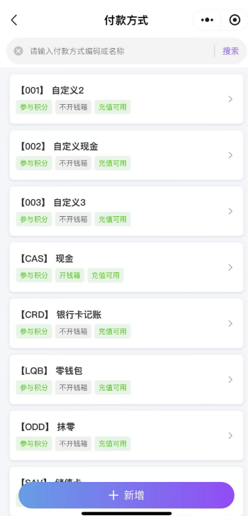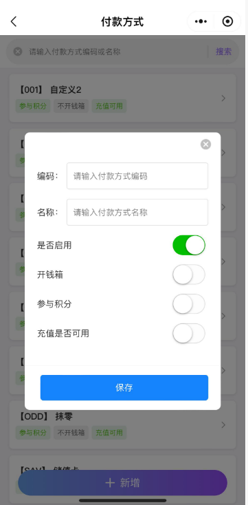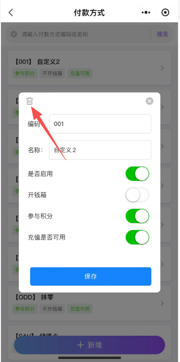 付款方式设置用于新增、编辑和删除付款方式。 新增付款方式点击新增,填写付款方式编码和名称,再设置是否启用、开钱箱、参与积分、充值是否可用。 如图所示 编辑、删除付款方式选中付款方式,可以对付款方式进行编辑;点击左上角删除按钮还可以删除付款方式。 如图所示 文档更新时间: 2026-01-21 05:50 作者:徐珍