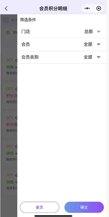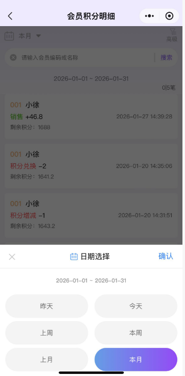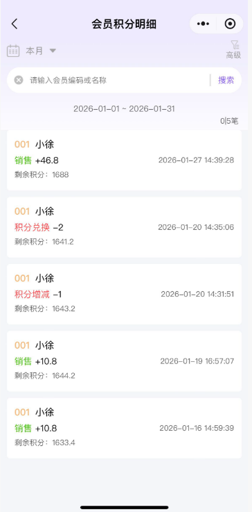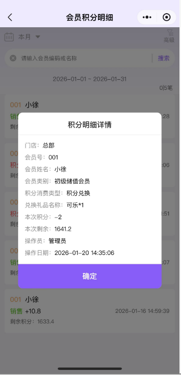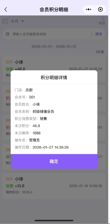 会员积分明细统计会员积分明细,点击进去可以查看具体的积分详情。 如图所示 点击左上角,可以筛选日期查看数据;点击右上角,可以按照门店、会员、会员类别筛选查看数据;总部账号默认支持查询各个门店数据,分店仅能查询所属门店数据。 如图所示 文档更新时间: 2026-01-29 05:27 作者:徐珍