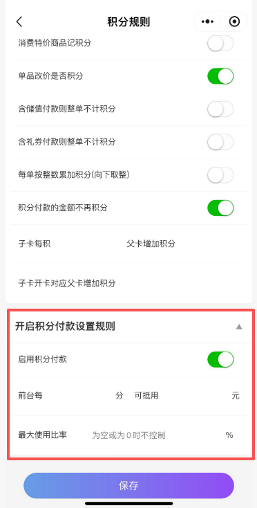 最大使用比例:按整单金额去控制,整单金额*设置比例=最大积分付款抵扣的金额