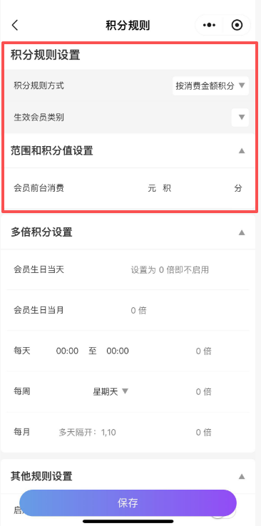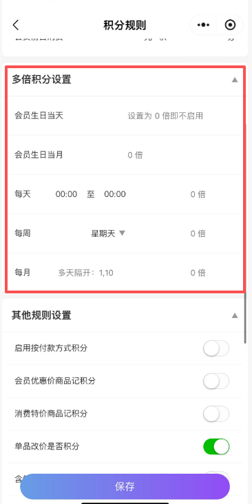 会员生日当月:可设置会员生日当月积分倍数,设置为0即不启用。