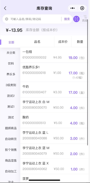 库存查询可以输入品名/条码/助记码查询商品的成本价和库存数量;总部可以点击右上角可以筛选门店进行查询,分店默认只能查询本门店的数据。 如图所示 文档更新时间: 2026-01-28 07:20 作者:徐珍