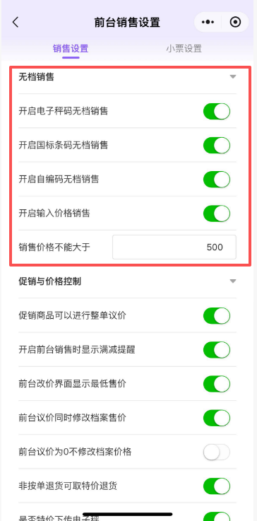 开启电子秤码无档销售:在前台扫码电子秤码(13或18位)是否新增商品。