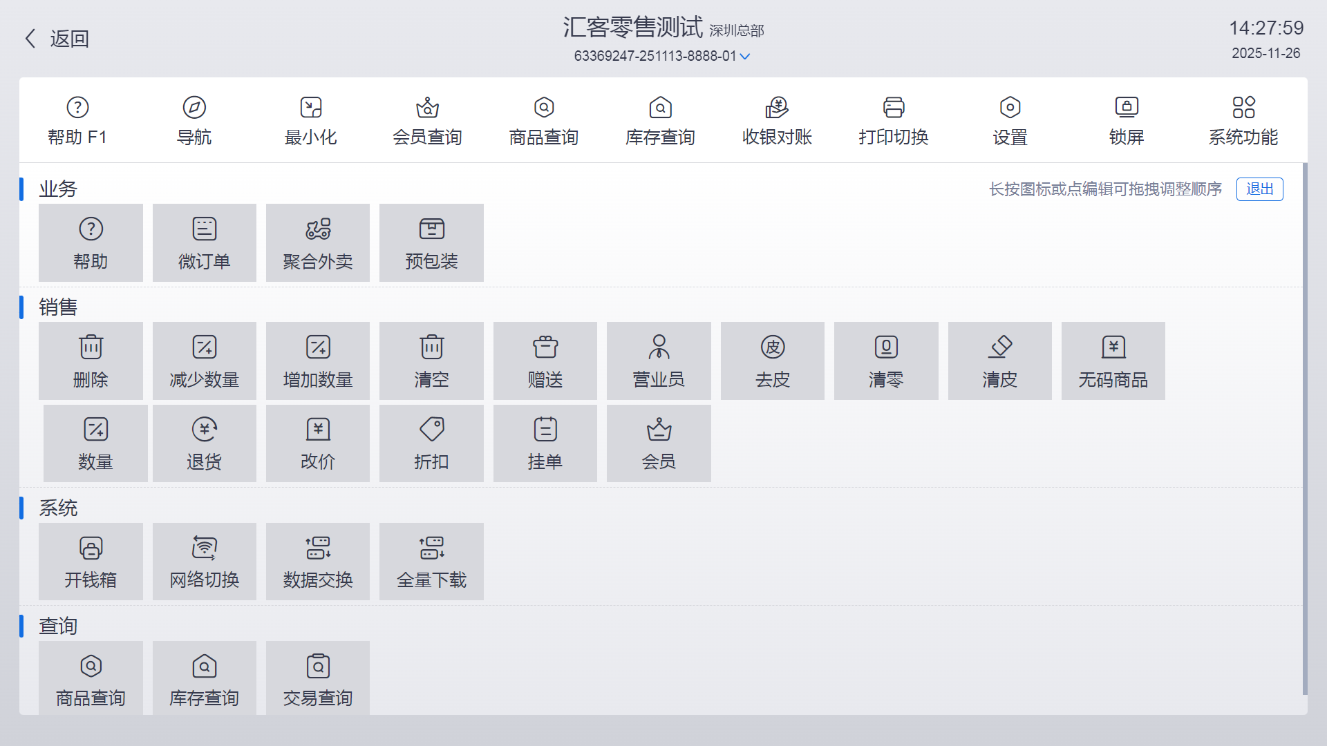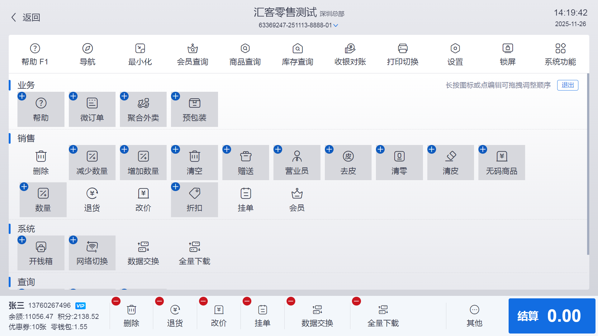 不支持将其他界面的功能项调整至销售界面底部使用,只能在其它界面进行功能顺序调整
