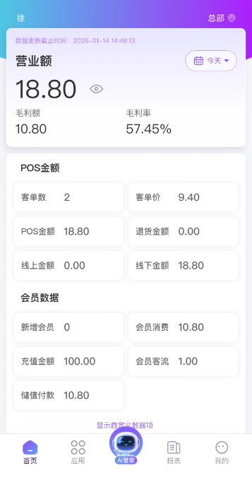 首页统计项包括:营业额、毛利额、毛利率、POS金额、会员数据。
