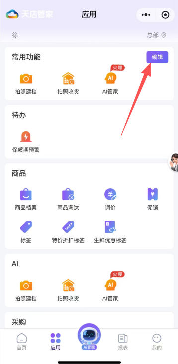 常用功能包括拍照建档、拍照收货、AI管家,可进入[应用]模块自定义编辑常用功能。