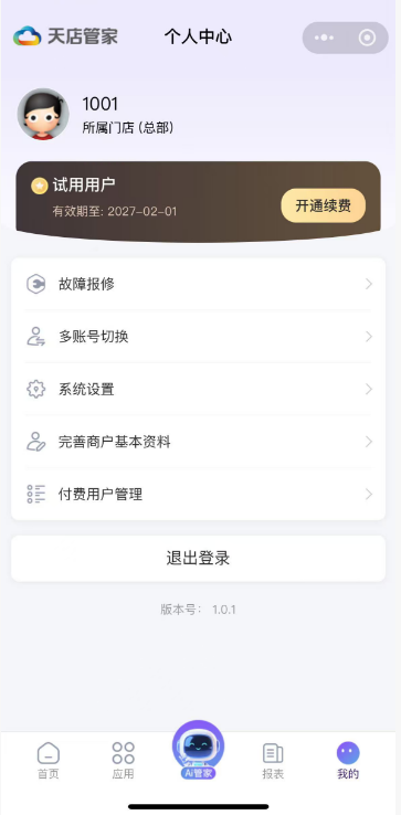 目录 搜索 汇客·学习指南汇客·Windows前台使用须知注册&前台登录界面使用销售商品查询会员结算退货其他微订单聚合外卖库存查询交易查询收银对账系统功能帮助导航风格切换最小化收银对账设置POS快捷键打印 & 钱箱外设秤相关其他扫码付主题界面设置模板锁屏退出场景应用营业员使用流程挂单使用流程培训模式预设商品业务AI使用流程预包装使用流程类别限定显示常见咨询安装咨询登录咨询核销咨询交易时已经支付款项,但是软件未有流水记录结算咨询适配型号大全打印机型号适配计价秤支持型号客显支持型号叠加器支持型号汇客·安卓POS收银一、登录二、收银2.1 收银界面介绍2.2 收银流程介绍三、商品四、会员五、生意六、对账七、设置1.用户信息2.业务设置3.硬件设置 4.生鲜条码格式5.传称6.标签打印7.语音播报8.参数导入导出9.畅销商品10.关于八、更多九、支持促销类型十、安卓POS适配大全汇客.手机APP收银下载安装登录app开单销售按单退货交易查询收银对账系统设置数据下传库存盘点更多功能退出登录汇客·管店小程序使用须知工作台微管家商品管理营销管理订单管理报表查询应用商品AI采购配送库存会员报表营业分析营业分析毛利分析门店分析笔单分析商品排行类别销售商品毛利我的月报年报商品查询库存查询收银查询收银对账交易明细查询收银异常操作会员查询会员分析营业员销售查询我的VIP增值服务多账号切换系统设置打印设置总部订货、收货快速查询商品门店库存收货快速引用商品生成调价单单据详情显示售价及售价金额收货/调拨引用单据时自动读取数量电子海报市斤计价标签设置汇客·管家使用须知首页应用常用功能待办保质期预警商品商品档案商品淘汰调价促销标签特价折扣标签生鲜优惠标签AI拍照建档拍照收货AI管家采购订货收货退货供应商历史采购价采购设置配送要货调拨调拨收货库存盘点门店库存查询入库出库会员会员档案会员开卡积分冲减积分兑换会员设置会员类别积分规则充值优惠规则零售付款方式设置支付设置POS登记前台销售设置微管家商品管理营销管理订单管理报表查询系统用户管理授权码标签设置消息推送报表常用功能营业分析营业分析毛利分析门店分析笔单分析商品排行类别销售品牌销售商品毛利我的月报年报商品查询库存查询库存调整查询出入库明细收银查询收银对账交易明细查询收银员异常操作会员查询会员分析储值明细会员消费明细会员积分明细营业员销售查询我的故障报修多账号切换系统设置完善商户基本资料付费用户管理汇客·价签工具汇客传秤工具传秤工具·支持型号传秤工具·使用流程 暂无相关搜索结果! 本文档使用 MinDoc 发布 我的 我的 故障报修 多账号切换 系统设置 完善商户基本资料 付费用户管理 如图所示 文档更新时间: 2026-01-29 05:42 作者:徐珍