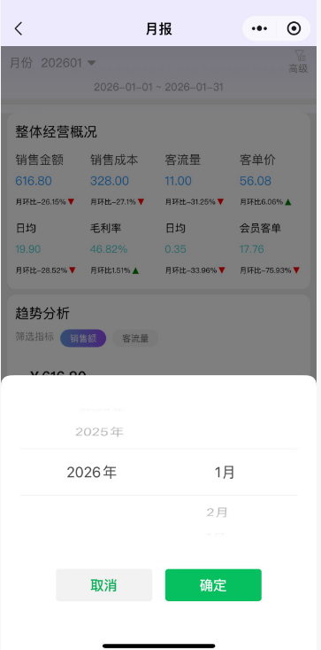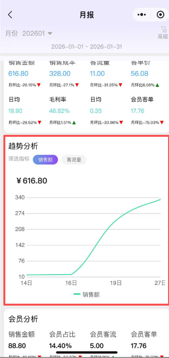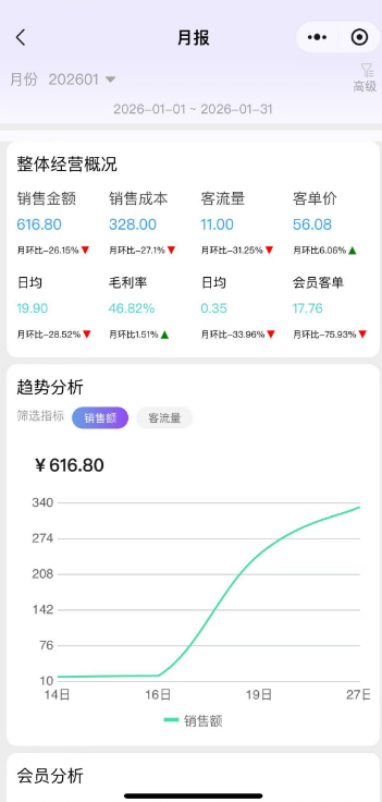 统计销售金额、销售成本、客流量、客单价、日均销售金额、毛利率、日均客流量、会员客单,以及各项的月环比。