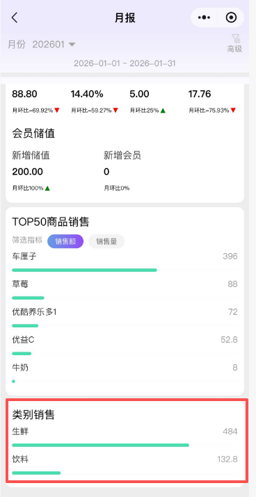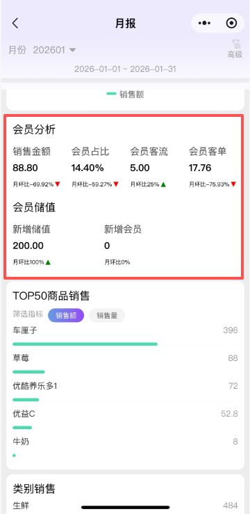 用于统计各月份的整体经营概况、趋势分析、会员分析、TOP50商品销售、类别销售。