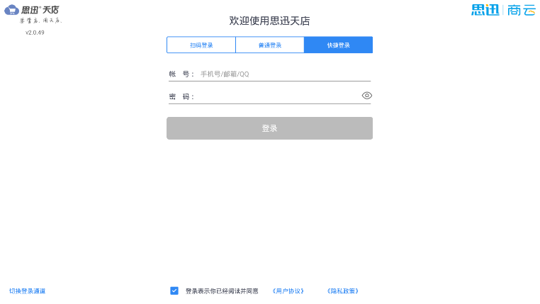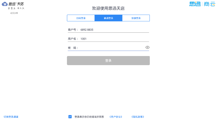目录 搜索 汇客·学习指南汇客·Windows前台使用须知注册&前台登录界面使用销售商品查询会员结算退货其他微订单聚合外卖库存查询交易查询收银对账系统功能帮助导航风格切换最小化收银对账设置POS快捷键打印 & 钱箱外设秤相关其他扫码付主题界面设置模板锁屏退出场景应用营业员使用流程挂单使用流程培训模式预设商品业务AI使用流程预包装使用流程类别限定显示常见咨询安装咨询登录咨询核销咨询交易时已经支付款项,但是软件未有流水记录结算咨询适配型号大全打印机型号适配计价秤支持型号客显支持型号叠加器支持型号汇客·安卓POS收银一、登录二、收银2.1 收银界面介绍2.2 收银流程介绍三、商品四、会员五、生意六、对账七、设置1.用户信息2.业务设置3.硬件设置 4.生鲜条码格式5.传称6.标签打印7.语音播报8.参数导入导出9.畅销商品10.关于八、更多九、支持促销类型十、安卓POS适配大全汇客.手机APP收银下载安装登录app开单销售按单退货交易查询收银对账系统设置数据下传库存盘点更多功能退出登录汇客·管店小程序使用须知工作台微管家商品管理营销管理订单管理报表查询应用商品AI采购配送库存会员报表营业分析营业分析毛利分析门店分析笔单分析商品排行类别销售商品毛利我的月报年报商品查询库存查询收银查询收银对账交易明细查询收银异常操作会员查询会员分析营业员销售查询我的VIP增值服务多账号切换系统设置打印设置总部订货、收货快速查询商品门店库存收货快速引用商品生成调价单单据详情显示售价及售价金额收货/调拨引用单据时自动读取数量电子海报市斤计价标签设置汇客·管家使用须知首页应用常用功能待办保质期预警商品商品档案商品淘汰调价促销标签特价折扣标签生鲜优惠标签AI拍照建档拍照收货AI管家采购订货收货退货供应商历史采购价采购设置配送要货调拨调拨收货库存盘点门店库存查询入库出库会员会员档案会员开卡积分冲减积分兑换会员设置会员类别积分规则充值优惠规则零售付款方式设置支付设置POS登记前台销售设置微管家系统用户管理授权码标签设置消息推送报表常用功能营业分析营业分析毛利分析门店分析笔单分析商品排行类别销售品牌销售商品毛利我的月报年报商品查询库存查询库存调整查询出入库明细收银查询收银对账交易明细查询收银员异常操作会员查询会员分析储值明细会员消费明细会员积分明细营业员销售查询我的汇客·价签工具汇客传秤工具传秤工具·支持型号传秤工具·使用流程 暂无相关搜索结果! 本文档使用 MinDoc 发布 一、登录 1.登录方式登录界面,有三种登录方式:扫码登录、普通登录和快捷登录 1.1 扫码登录扫码登录:使用微信扫一扫登录 如图所示 1.2 普通登录普通登录:商户ID+用户名+密码登录。 如图所示 1.3 快捷登录快捷登录:绑定的手机号/邮箱/QQ+密码登录。 如图所示 ps:快捷登录需要账号已绑定手机号/邮箱/QQ,若提示不存在,可先用普通登录进入后台,绑定账号后即可使用快捷登录。文档更新时间: 2025-03-13 01:30 作者:朱磊君