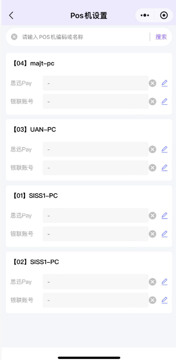 目录 搜索 汇客·学习指南汇客·Windows前台使用须知注册&前台登录界面使用销售商品查询会员结算退货其他微订单聚合外卖库存查询交易查询收银对账系统功能帮助导航风格切换最小化收银对账设置POS快捷键打印 & 钱箱外设秤相关其他扫码付主题界面设置模板锁屏退出场景应用营业员使用流程挂单使用流程培训模式预设商品业务AI使用流程预包装使用流程类别限定显示常见咨询安装咨询登录咨询核销咨询交易时已经支付款项,但是软件未有流水记录结算咨询适配型号大全打印机型号适配计价秤支持型号客显支持型号叠加器支持型号汇客·安卓POS收银一、登录二、收银2.1 收银界面介绍2.2 收银流程介绍三、商品四、会员五、生意六、对账七、设置1.用户信息2.业务设置3.硬件设置 4.生鲜条码格式5.传称6.标签打印7.语音播报8.参数导入导出9.畅销商品10.关于八、更多九、支持促销类型十、安卓POS适配大全汇客.手机APP收银下载安装登录app开单销售按单退货交易查询收银对账系统设置数据下传库存盘点更多功能退出登录汇客·管店小程序使用须知工作台微管家商品管理营销管理订单管理报表查询应用商品AI采购配送库存会员报表营业分析营业分析毛利分析门店分析笔单分析商品排行类别销售商品毛利我的月报年报商品查询库存查询收银查询收银对账交易明细查询收银异常操作会员查询会员分析营业员销售查询我的VIP增值服务多账号切换系统设置打印设置总部订货、收货快速查询商品门店库存收货快速引用商品生成调价单单据详情显示售价及售价金额收货/调拨引用单据时自动读取数量电子海报市斤计价标签设置汇客·管家使用须知首页应用常用功能待办保质期预警商品商品档案商品淘汰调价促销标签特价折扣标签生鲜优惠标签AI拍照建档拍照收货AI管家采购订货收货退货供应商历史采购价采购设置配送要货调拨调拨收货库存盘点门店库存查询入库出库会员会员档案会员开卡积分冲减积分兑换会员设置会员类别积分规则充值优惠规则零售付款方式设置支付设置POS登记前台销售设置微管家商品管理营销管理订单管理报表查询系统用户管理授权码标签设置消息推送报表常用功能营业分析营业分析毛利分析门店分析笔单分析商品排行类别销售品牌销售商品毛利我的月报年报商品查询库存查询库存调整查询出入库明细收银查询收银对账交易明细查询收银员异常操作会员查询会员分析储值明细会员消费明细会员积分明细营业员销售查询我的故障报修多账号切换系统设置完善商户基本资料付费用户管理汇客·价签工具汇客传秤工具传秤工具·支持型号传秤工具·使用流程 暂无相关搜索结果! 本文档使用 MinDoc 发布 支付设置 支付设置用于设置门店的思迅pay商户号和银联商户号。1、如果分店是共享总部支付账号,则不支持设置;分店是独立支付的可以设置。2、如果开启了按Pos机设置独立支付账号,则可以按照每个门店的Pos机设置独立支付账号。 如图所示 文档更新时间: 2026-01-21 07:06 作者:徐珍