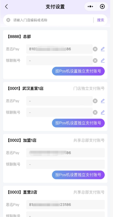 支付设置用于设置门店的思迅pay商户号和银联商户号。1、如果分店是共享总部支付账号,则不支持设置;分店是独立支付的可以设置。2、如果开启了按Pos机设置独立支付账号,则可以按照每个门店的Pos机设置独立支付账号。 如图所示 文档更新时间: 2026-01-21 07:06 作者:徐珍