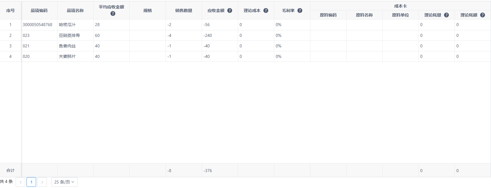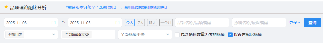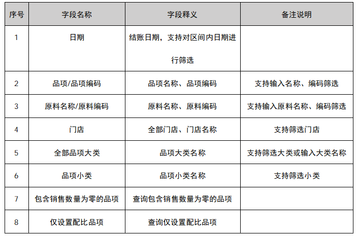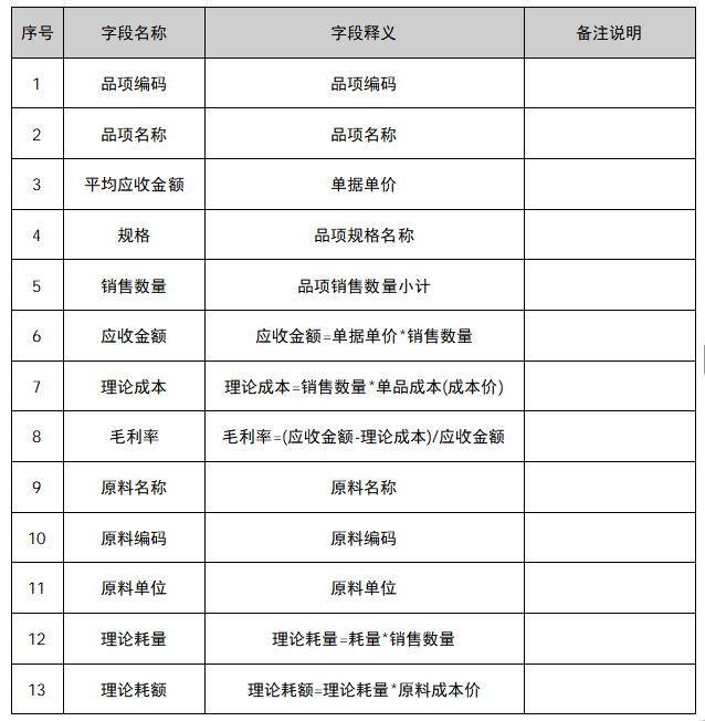 《品项理论配比分析》主要用来查询门店在指定日期内每个品项的销售、成本及原料配比相关统计,本表统计维度为结账日期。