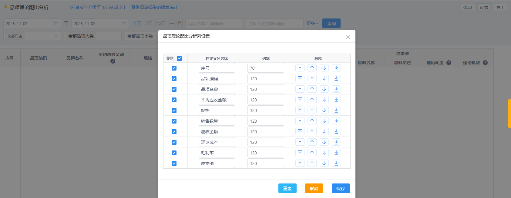 报表头部:说明、设置(品项理论配比分析列设置、自定义名称、列宽、上下移动)、导出