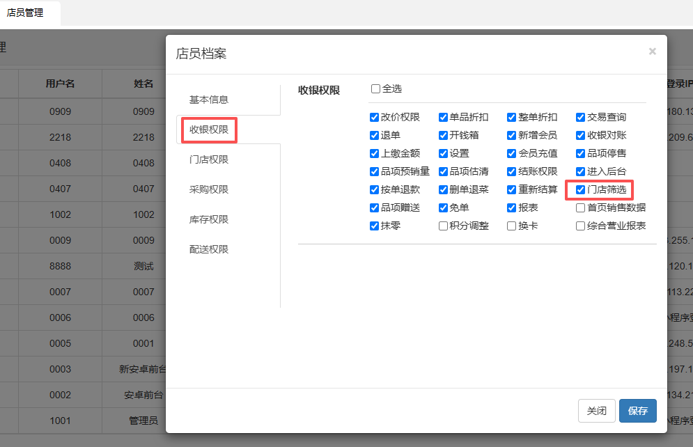(1)数据查看:总部管理员账号可查看所有门店数据,门店账号勾选上“门店筛选权限”,以及店员相应的门店权限,就可以切换门店进行查询。