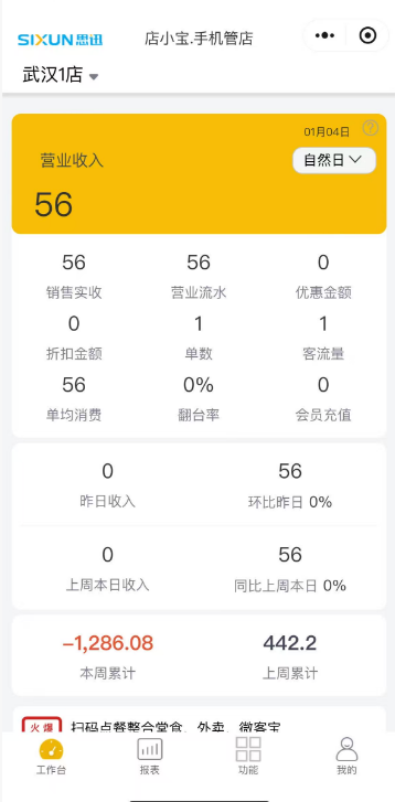 首页统计项包括:营业额、毛利额、毛利率、POS金额、会员数据。