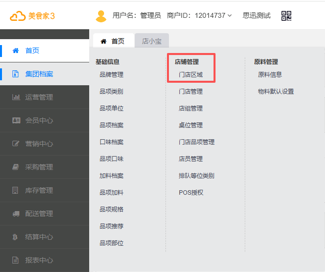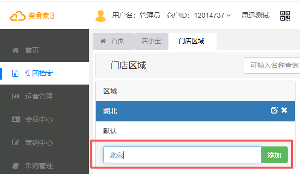 1.在美食家3后台集团档案——店铺管理中选择门店区域。