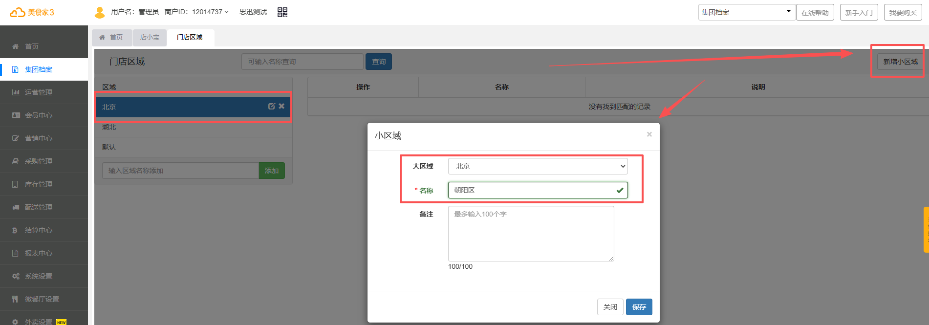 3.选择大区域,点击新增小区域,录入名称,点击保存,即门店区域新增成功。