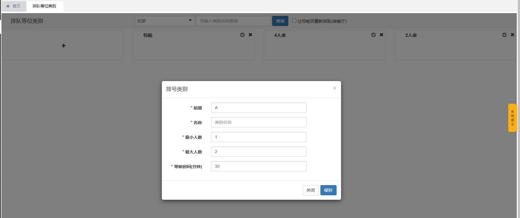操作:点击“+”按钮,录入前缀、类别名称、最小人数、最大人数、等候时间,点击保存即可。