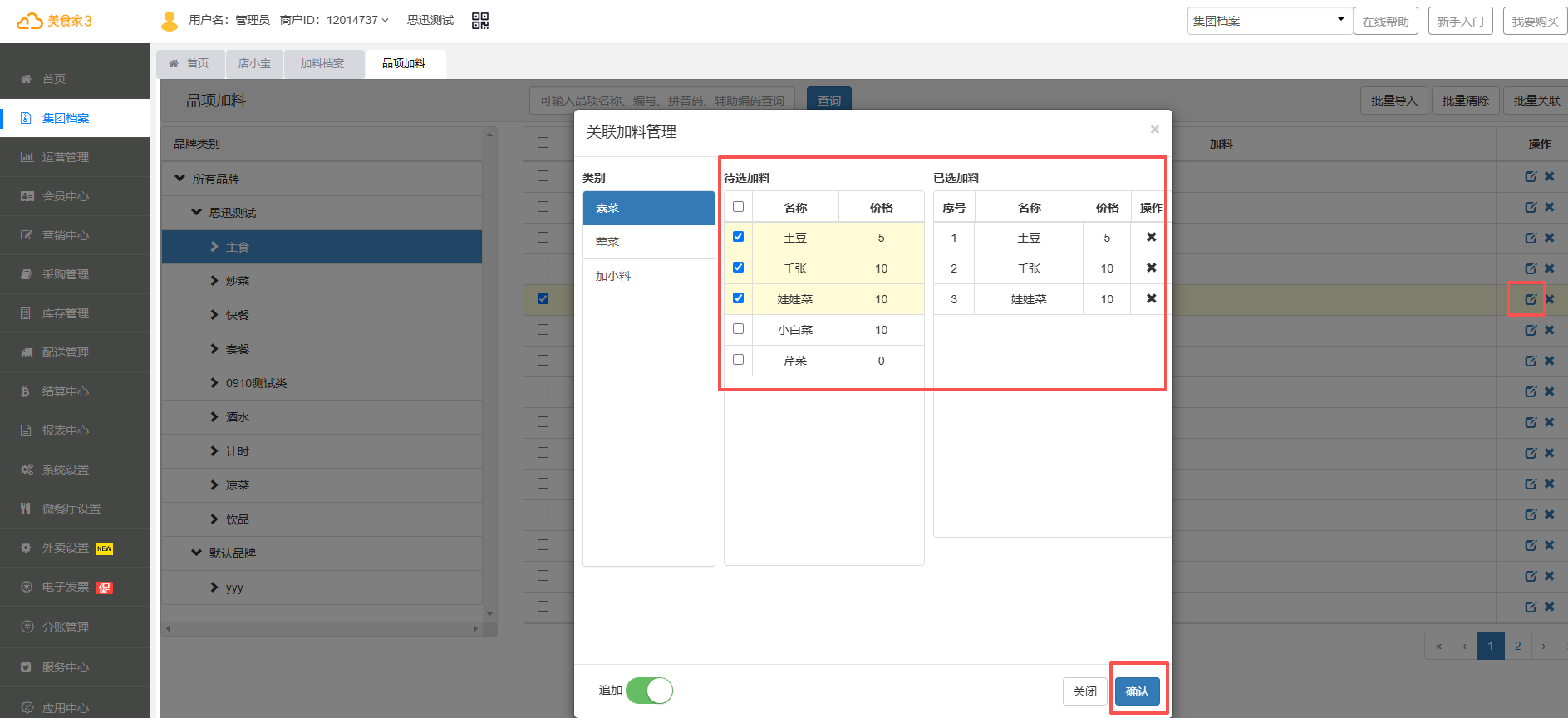 1.在后台集团档案——品项加料中选择品项可操作编辑按钮针对单个品项进行关联加料。