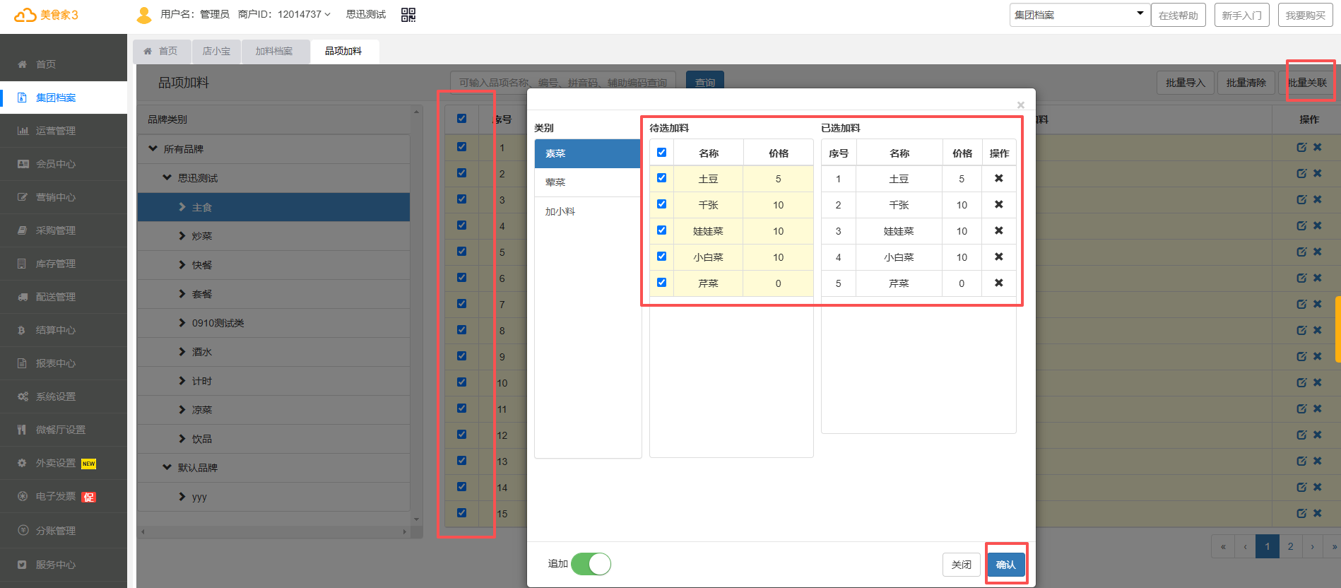2.也可以选择多个品项点击批量关联,针对多个品项进行关联加料。