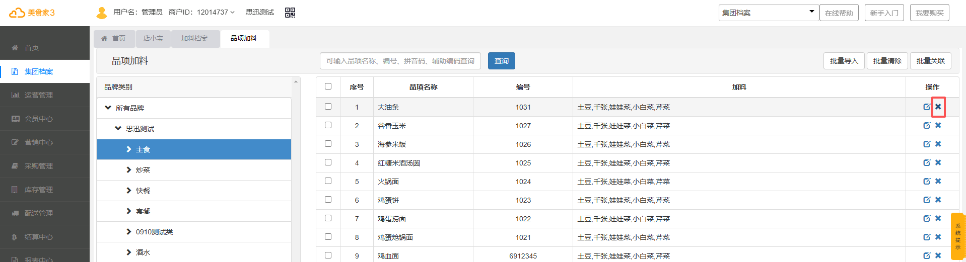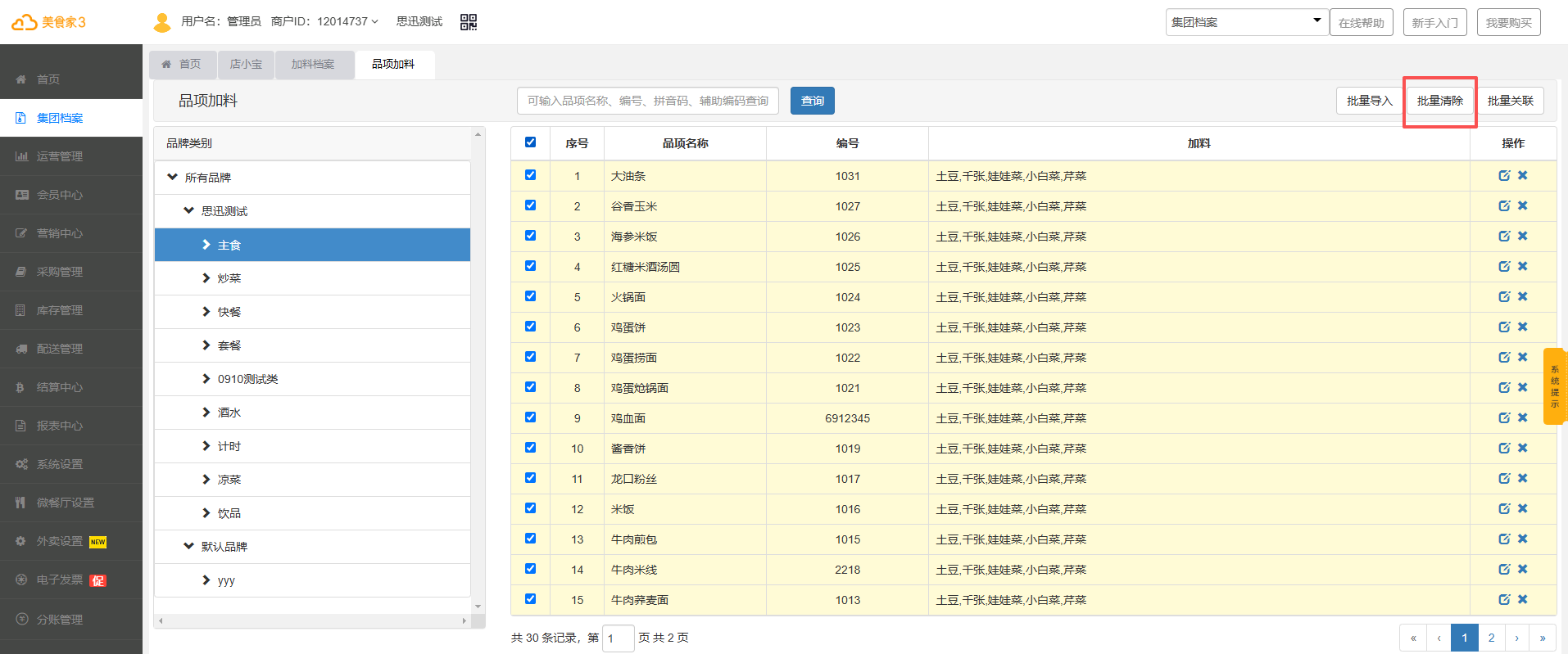在品项加料界面选择要清除的品项,点击批量清除即可清除成功。