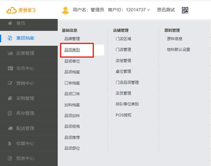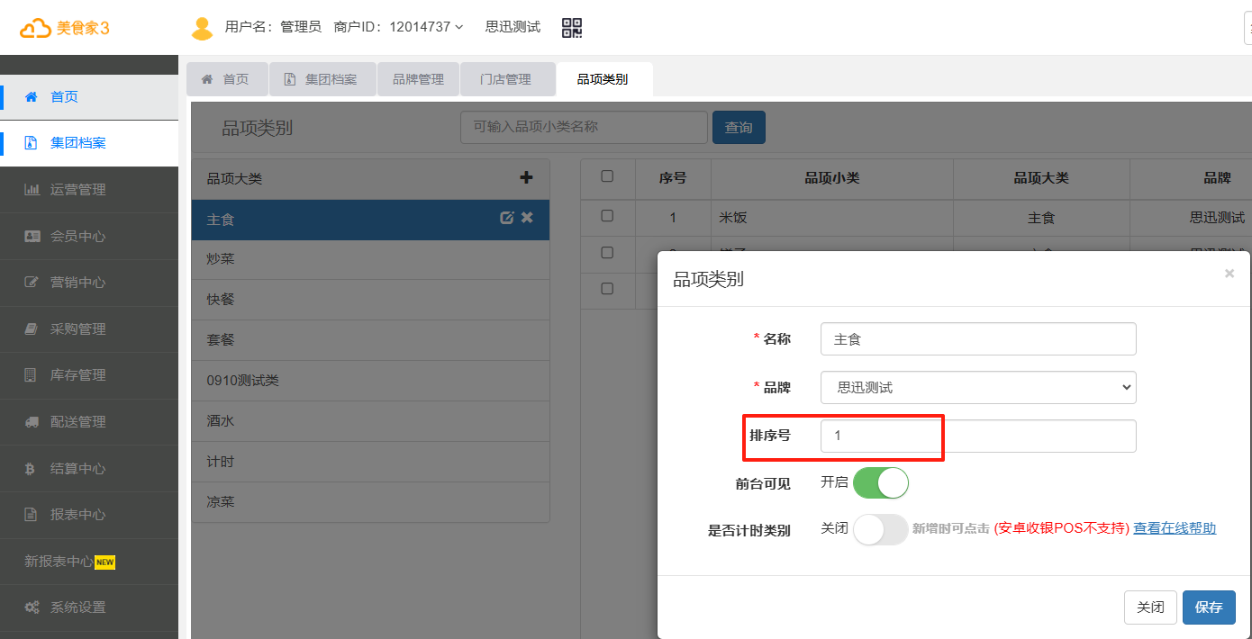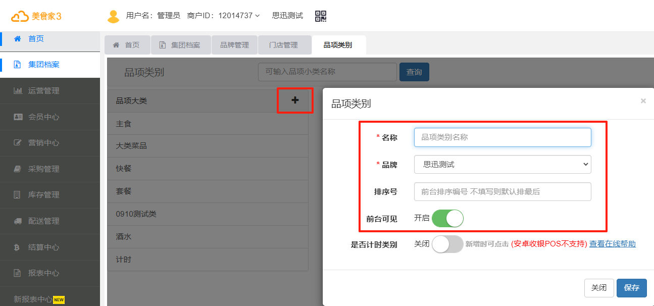 2.点击品项大类右侧的“+”按钮,录入大类名称,选择品牌,开启前台可见,点击保存,大类即可建立成功。