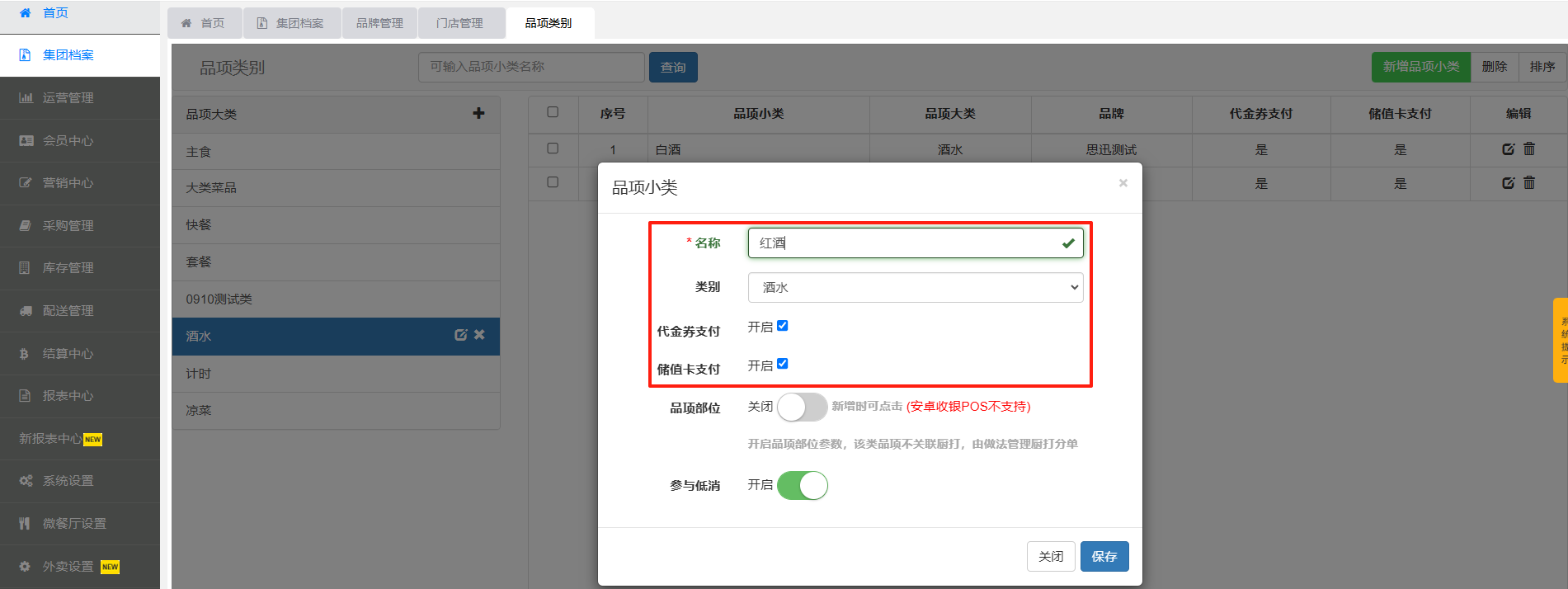 2.录入小类名称,类别默认为上一步选择的大类,如需更改可自行选择,然后勾选代金券、储值卡支付,点击保存即可创建成功。