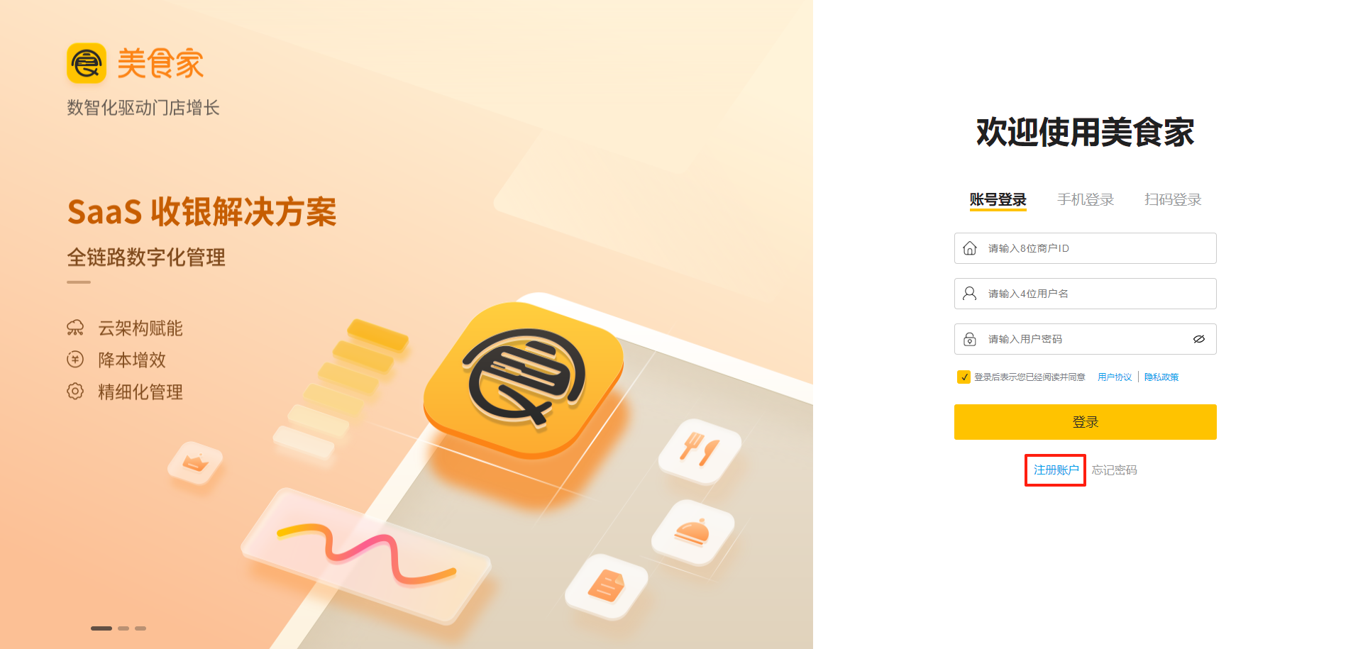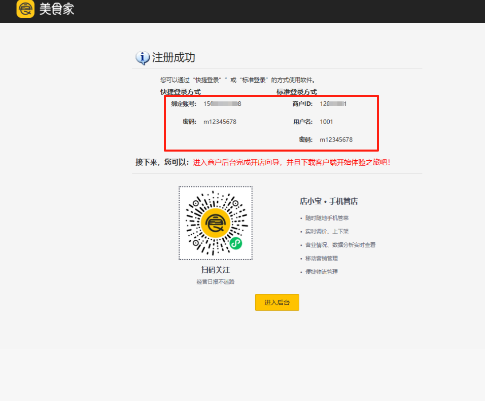 3.注册成功后界面上回显示商户的注册信息,包含手机号,商户ID,密码等,建议保存备份。