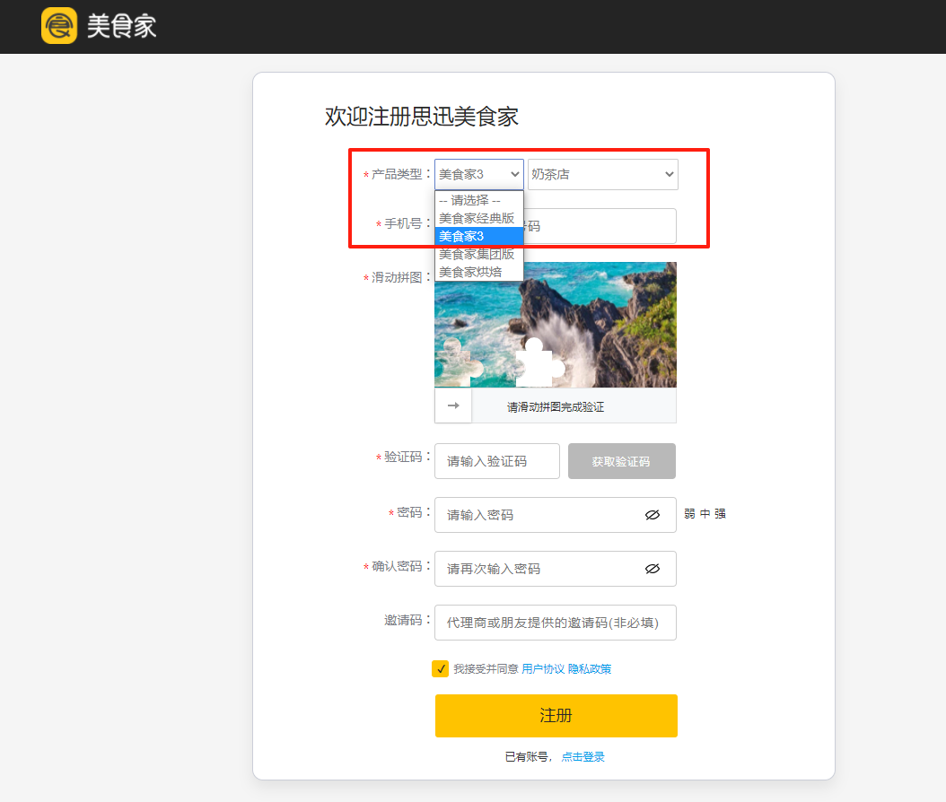 2.选择产品类型,填写注册的手机号,滑动拼图验证,获取验证,设置密码,确认密码,接受同意“用户协议,隐私政策”,最后点击“注册”按钮即可完成注册。
