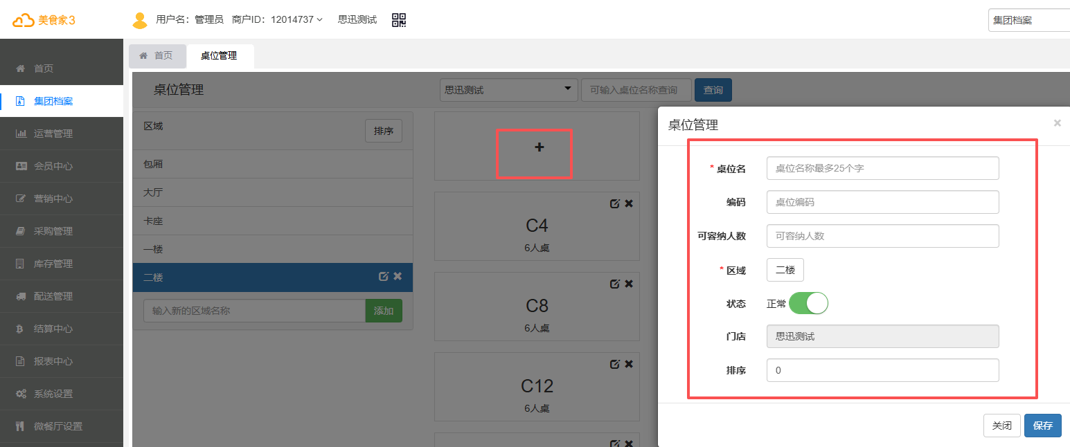 3.点击“+”按钮,录入桌位名、可容纳人数、选择区域、状态开启正常,点击保存即可。