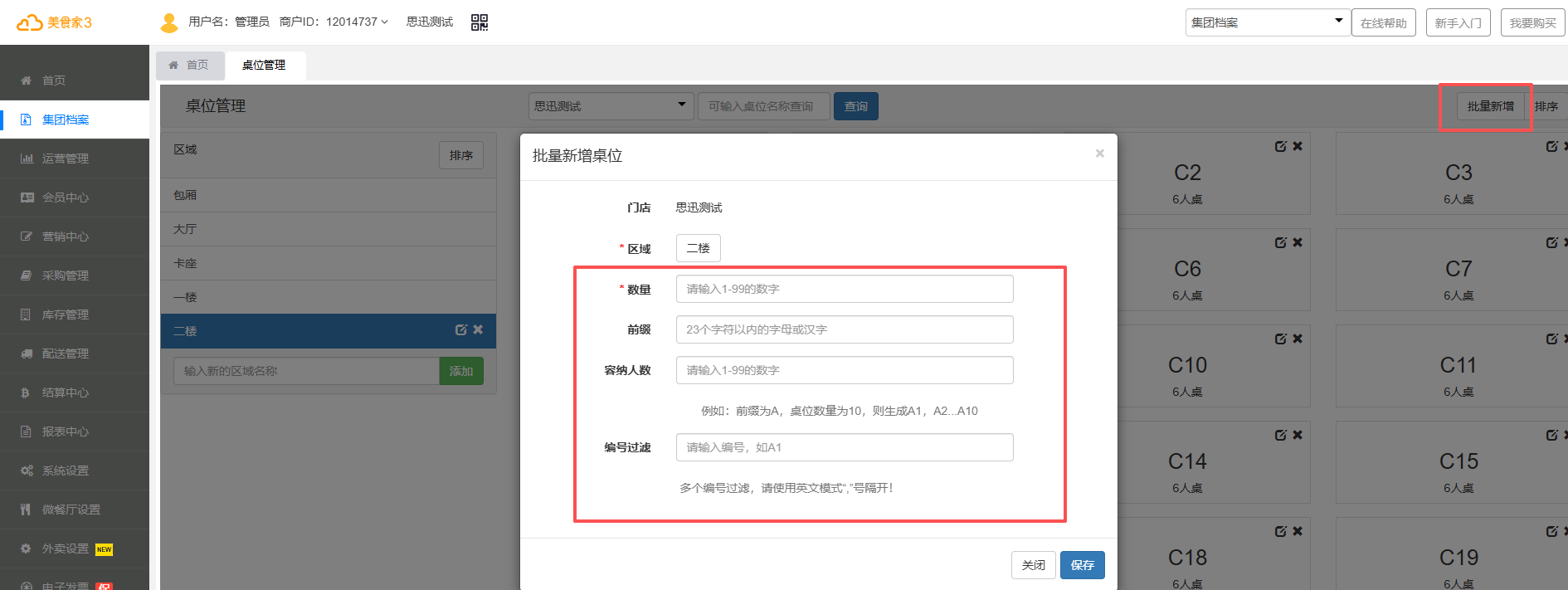 4.也可批量新增,点击右上角“批量新增”按钮,选择区域、录入数量、前缀、容纳人数、编号过滤点击保存即可。