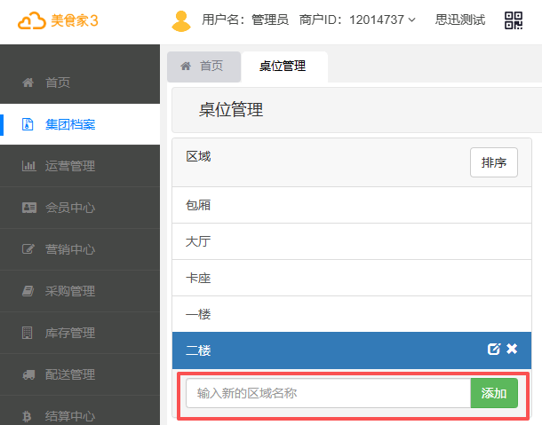 2.录入区域名称,点击“添加”桌位区域添加成功。