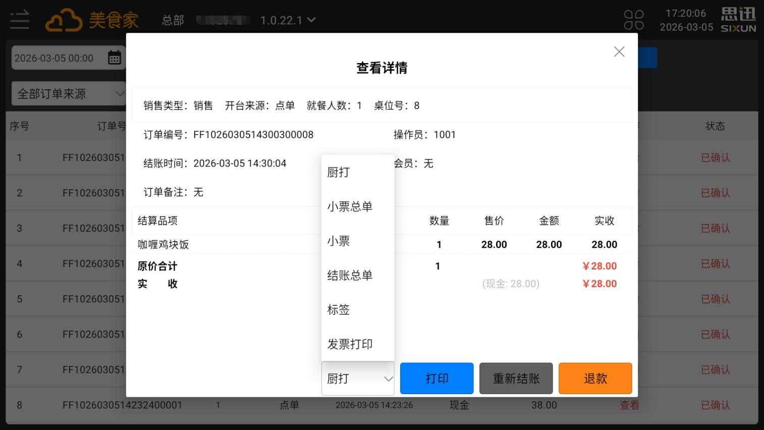 查看按钮显示订单明细 - 重打印:支持补打小票(需连接打印机)