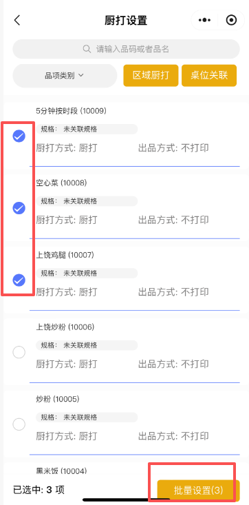 点击菜品,可以单独设置厨打方案和出品方案;也可以勾选多个菜品,再点击批量设置,同时对多个菜品设置厨打方案和出品方案。