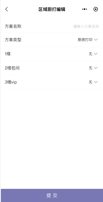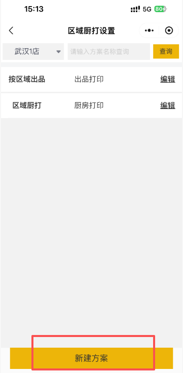 点击区域厨打,再点击新建方案,可以新建区域厨打方案和区域出品方案,根据餐桌区域选择打印机;设置好后,菜品设置厨打方案时,厨打类型和出品类型需要选择区域厨打或者区域出品。