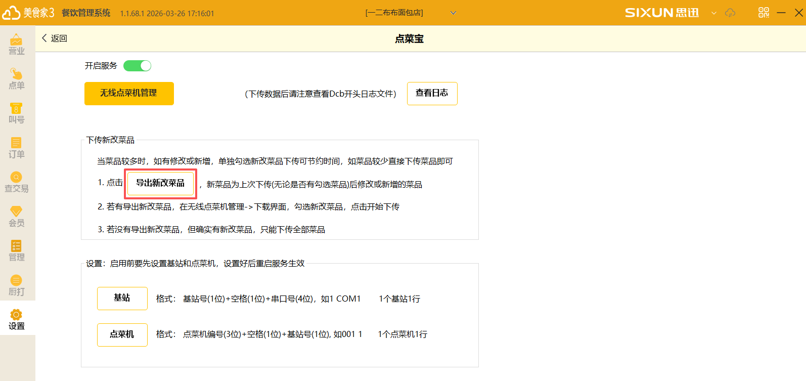 新改下传:增量下载,仅适用于少量菜品修改或者新增下传。首先先导出新改菜品,接着在下载界面勾选“新改菜品”进行下传。