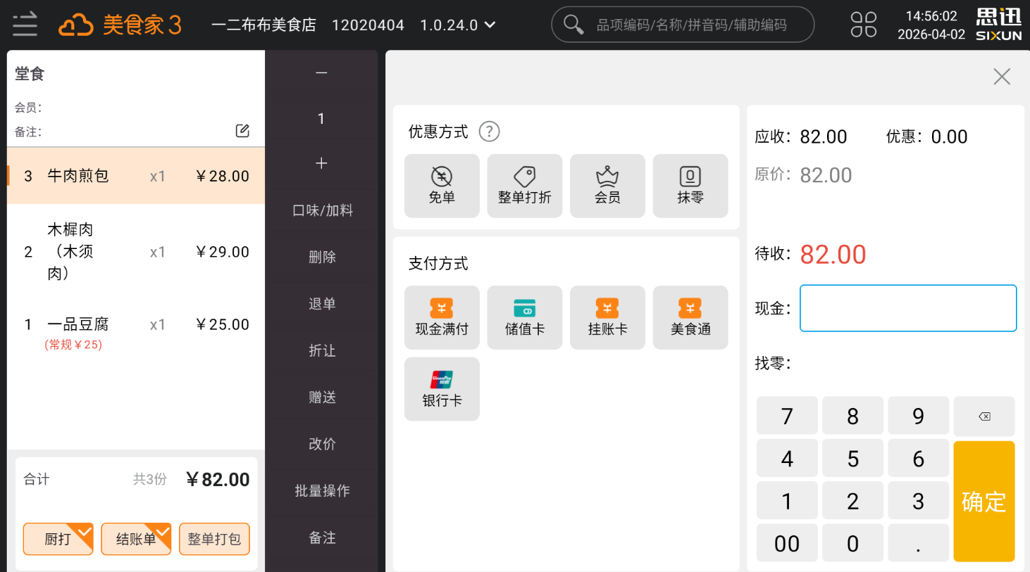 在点单界面点击结算按钮,结算时可以选择多种支付方式,例如部分金额使用移动支付,部分金额使用现金支付,确认金额输入无误后,点击确定完成订单结算流程。